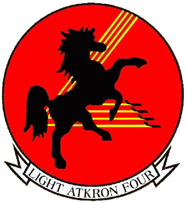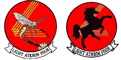 The Squadron's Original Yellow Jacket Patch Was Approved By The CNO On March 7, 1969. The Insignia Depicted A North American Predatory "Yellow Jacket" Wasp With Silver Wings Stinging An Exploding Target With A Lightning Bolt From It's Stinger. The Wasp Was Placed Over Four Black Stylized Aircraft With Yellow Contrails On A Red Background. The White Underlying Scroll Enclosed The Words "Light Atkron Four" In Black Lettering.