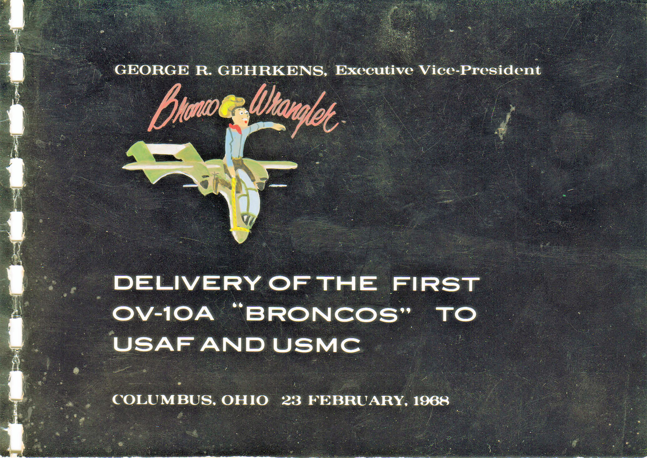 North American Rockwell-Columbus February 1968 • In a unique dual-service ceremony, representatives from the U.S. Marine Corps and U.S. Air Force officially accepted delivery of their new OV-10A Broncos from company officials. From left to right, George R. Gherkens, executive vice president Columbus Division, North American Rockwell; Col. P.P. Upschulte, USMC,commanding officer of VMO-5 at Camp Pendleton; Maj. Gen. L.B. Robertshaw, USMC, Marine liaison officer, Office of Chief of Naval Operations; Maj. Gen. Thomas Corbin, USAF, commanding officer, Special Air Warfare Center,Eglin Air Force Base, Florida and W.H. Yahn, Columbus Division president with North American Aviation Rockwell. - Photo from the Roy Mills Collection