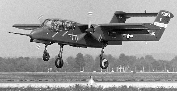 The pilot and co-pilot sat in tandem in a full-windowed "greenhouse-style" cockpit with generally great visibility from any direction but to the rear. The cockpit was positioned as such that forward seat was held out well past the engines themselves. Both cockpit positions were afforded ejection seats for improved crew survivability ( helped along by the Broncos inherently rugged design and construction). The fuselage nacelle featured a cabin area at rear with space for could fit two medical litters and one medical attendant or five combat-ready infantrymen. Up to 3,200lbs of supplies could also be taken aboard if need be.