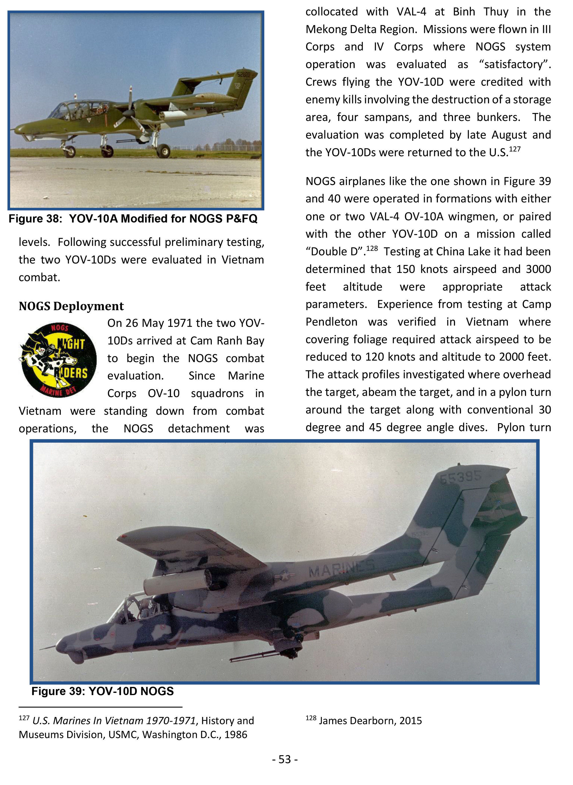 |•| The two YOV-10Ds arrived in Vietnam on May 7, 1971 for combat evaluation with the VAL-4 "Black Ponies" at NSA Binh Thuy. Before & after the NOGS operated with the Black Ponies in 1971, average 20 mm ammunition usage was 5,138 rounds a month; from June 5 to August 13, 1971 the average usage went up to 50,527 rounds as the Black Ponies & NOGS fired 151,580 rounds. The YOV-10Ds flew 207 missions with 275 confirmed enemy kills and 23 injured, 63 sampans were destroyed and at least 30 damaged, 39 structures were damaged and 14 were destroyed, 19 secondary fires were noted and 36 secondary explosions were heard, 7 bunkers were destroyed and 19 damaged and 4 supply caches were destroyed/damaged.